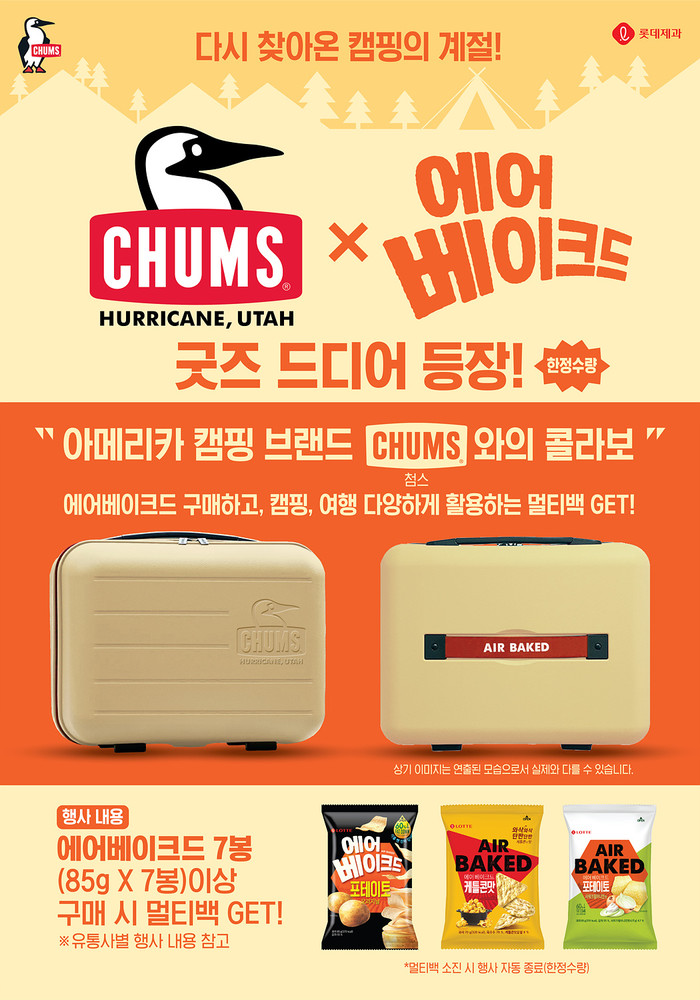 [시민일보 = 여영준 기자]롯데제과는 공기로 구운 스낵 에어베이크드가 미국 캠핑 브랜드 첨스(CHUMS)와 손잡고 굿즈 마케팅을 전개한다고 13일 밝혔다.