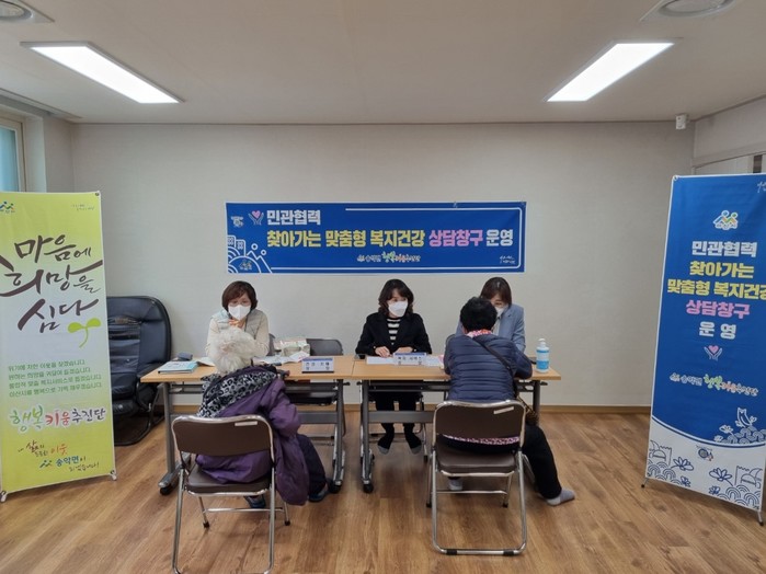 충남 아산시 송악면 행복키움추진단은 최근 송악면 노인회관 분회에서 '찾아가는 맞춤형 보건·복지 상담창구'를 예약제로 운영했다. 상담창구를 통해 노인 안부 확인, 필요 서비스 안내·상담 등을 안내하며 맞춤형 원스톱 서비스를 제공했다. 사진은 이날 주민들이 맞춤형 보건·복지 상담창구에서 상담을 받고 있는 모습. (사진제공=아산시청)