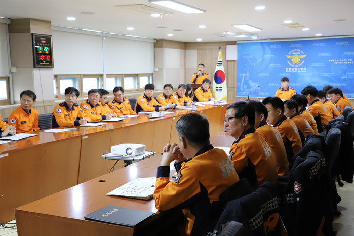 인천 남동소방서는 17일 대회의실에서 현장 중심의 긴급 구조 대응 역량 강화를 위해 ‘긴급구조통제단 기능숙달 도상훈련’을 했다. 이날 긴급 화재 상황을 가정해 작전지휘 절차와 통제단 부·반별 임무에 대해 논의했다. 사진은 회의하는 모습. (사진제공=남동소방서)
