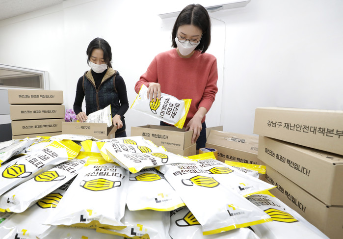 서울 강남구가 최근 지역내 만 65세 이상 노인 7만5000명에게 1인당 20매씩 KF94 마스크 총 150만장을 지급했다. 사진은 마스크를 포장하고 있는 구청 공무원들의 모습. (사진제공=강남구청)