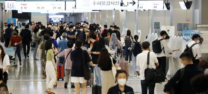 8일 오전 김포공항이 시민들로 붐비고 있다. 정부는 확산세가 꺾이지 않으면 새 거리두기 최고 수위인 4단계 적용도 검토한다는 방침이다.