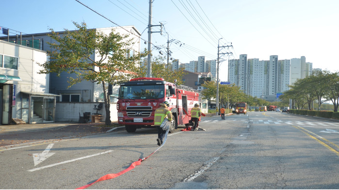 | ▲ 양산소방서, 대형화재현장 소방용수 보급훈련 사진 |