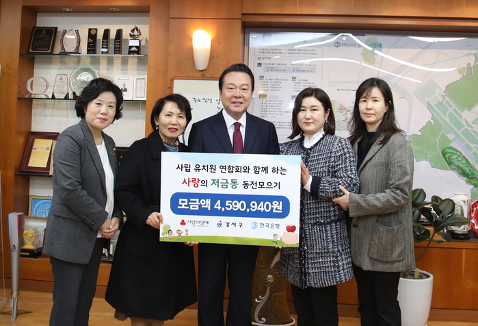 강서구는 26일 오후 어린이집 연합회와 사립유치원 연합회로부터 ‘사랑의 저금통’을 각각 전달받았다. 성금 1600여만원은 희귀성 질환을 앓고 있는 아이들을 위해 쓰일 예정이다. 사진은 노현송 구청장(가운데)과 관계자들이 기념촬영을 하는 모습. (사진제공=강서구청)