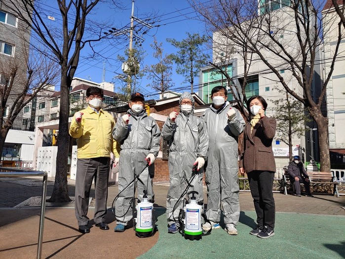 서울 은평구 역촌동 자율방재단은 최근 지역 주민의 놀이공간과 휴게공간으로 널리 이용되는 지역내 어린이공원 4곳 및 마을마당 2곳의 방역활동을 실시했다. 사진은 이날 자율방재단이 방역활동을 한 뒤 기념촬영을 하는 모습. (사진제공=은평구청)