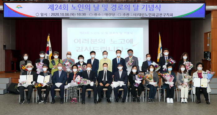 서울 금천구(구청장 유성훈)가 10월 경로의 달을 맞아 최근 구청 대강당에서 ‘제24회 노인의 날 및 경로의 달’ 기념식을 개최했다. 사진은 기념식에 참석한 유성훈 구청장(뒷줄 가운데)과 수상자들이 기념촬영을 하고 있는 모습. (사진제공=금천구청)