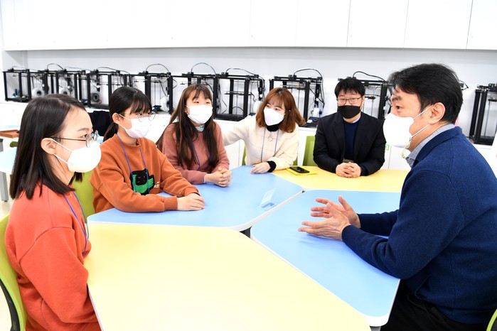 경기 하남형 미래학교 ‘꿈트리’가 최근 큰 호응 속에 마무리됐다. 꿈트리는 지역내 학생 20명을 선발해 총 6주간 에듀테크 수업, 학생주도 프로젝트 등 미래교육 프로그램을 진행했다. 사진은 발표회 및 졸업식에 참석한 김상호 시장(오른쪽)이 학생들과 이야기 나누고 있는 모습. (사진제공=하남시청)