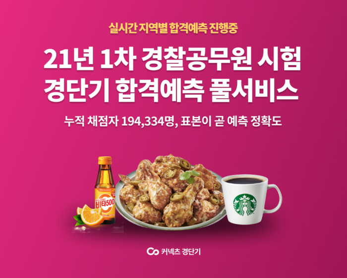 오는 6일 시험 실시 전 경단기의 합격예측 풀서비스를 사전예약한 수험생이 시험 당일 오후 3시 이전 채점을 진행한 경우 치킨과 콜라 세트, 커피 등을 추첨을 통해 제공하며, 시험 당일에도 응시 정보를 입력하면 피자, 치킨, 아이스크림, 아메리카를 시간대별로 나눠 추첨 증정한다.