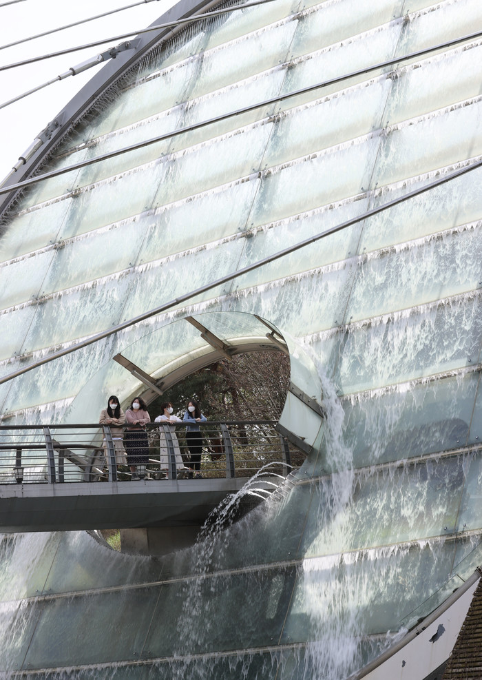 1일 서울 서초구 예술의전당 인근 아쿠아 아트 육교 워터스크린으로 물이 흘러내리고 있다.