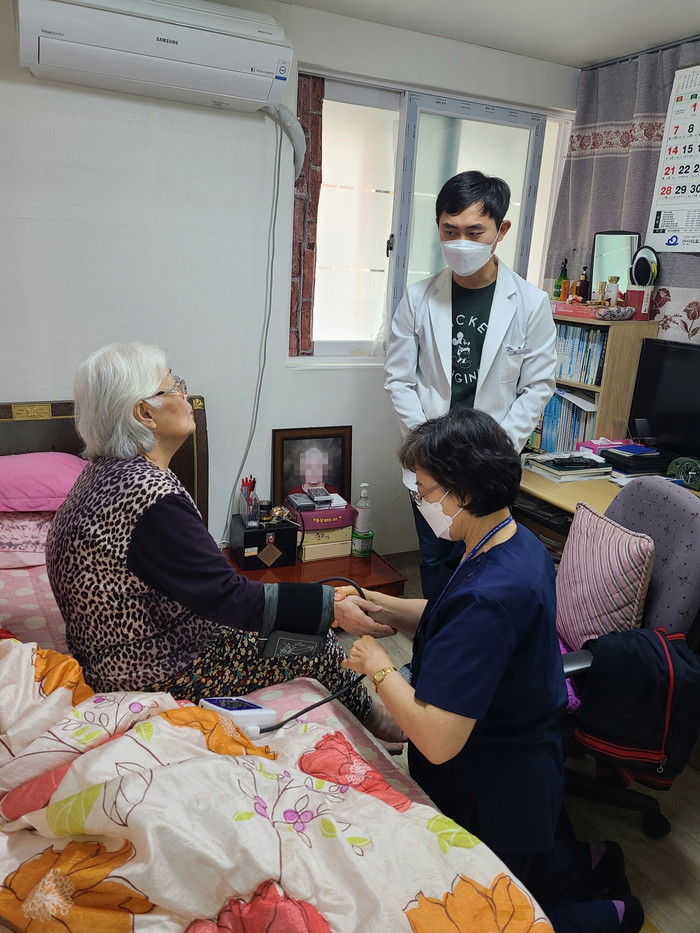경기 안산시는 지역사회 통합돌봄 선도사업의 일환으로 본격적인 ‘안산형 주치의 시범사업’을 추진하고 있다. 주치의 시범사업은 의사 등으로 구성된 방문진료팀이 맞춤형 통합방문서비스를 제공하는 것이다. 사진은 방문진료팀이 최근 한 노인가정을 방문해 혈압을 체크하고 있는 모습. (사진제공=안산시청)