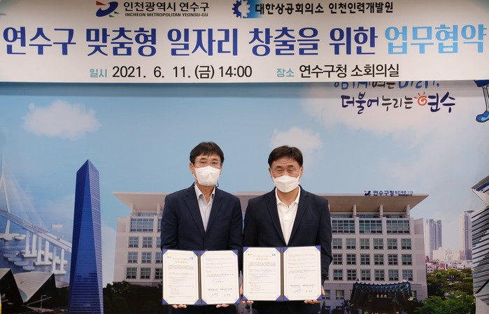 인천 연수구가 최근 구 맞춤형 일자리 창출을 위해 대한상공회의소 인천인력개발원과 업무협약을 체결했다. 이번 협약으로 양 기관은 연수구 맞춤형 일자리 창출위한 직업훈련교육 등에 앞장설 예정이다. 사진은 협약식에서 고남석 구청장(오른쪽)이 관계자와 기념촬영을 하는 모습. (사진제공=연수구청)