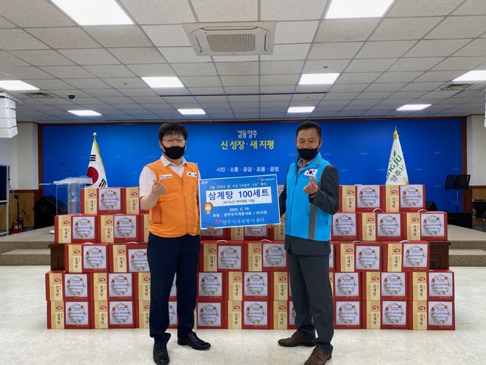 경기 양주시 양주무지개봉사회는 지난 19일 가정의 달을 맞아 지역내 홀몸노인 등 취약계층 100가정에 삼계탕을 후원하는 ‘사랑의 나눔 행사’를 개최했다. 사진은 행사 참여자들이 기념촬영을 하는 모습. (사진제공=양주시청)