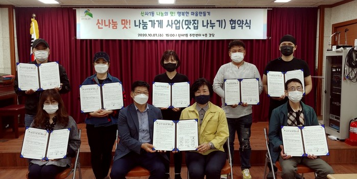 서울 은평구 신사1동 주민센터와 신사1동지역사회보장협의체가 최근 지역내 맛집 9곳과 저소득·홀몸노인, 한부모 가족 등 지역내 취약계층을 대상으로 매월 음식을 포장·지원하기로 업무협약을 체결했다. 사진은 협약 후 관계자들이 기념촬영을 하는 모습. (사진제공=은평구청)