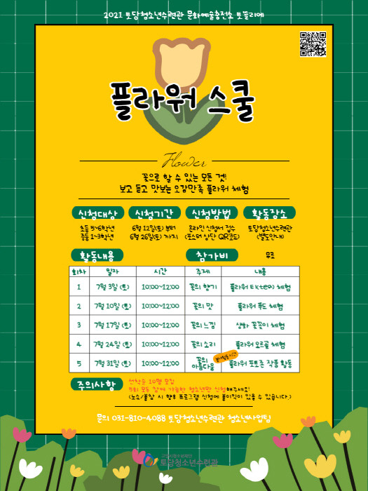 ‘플라워 스쿨’은 고양시 관내 거주 또는 재학 중인 초등학생 5학년부터 중학생 3학년까지의 청소년이라면 누구든지 신청(선착순)할 수 있다. 프로그램 참가비는 무료로신청 및 접수 방법은 토당청소년수련관 홈페이지(https://www.gcyf.or.kr/td/) / 또는 810-4088(청소년사업팀)으로 문의하면 된다.