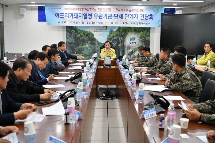 경기 포천시가 18일 시 재난안전대책본부에서 아프리카돼지열병 차단 방역에 협조하고 있는 시의회, 군부대, 경찰서 등 유관기관 관계자들과 간담회를 열고 방역대책 추진사항 보고, 대책 등을 논의했다. 사진은 박윤국 시장 및 관계자들의 회의 모습. (사진제공=포천시청)
