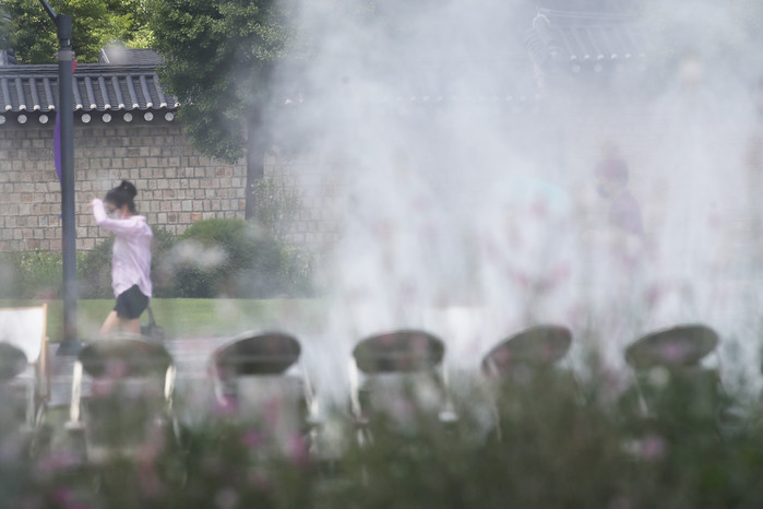 21일 오전 서울 종로구 국립현대미술관 서울관 마당에서 시민들이 뿜어져나오는 물안개 옆을 지나가고 있다.