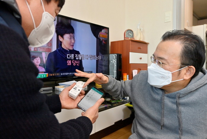 서울 양천구가 연말까지 사회적 고립가구의 안전망 확충을 위해 중장년 가구에 전력 사용량으로 생활 활동을 감지하는 사물인터넷(IoT) 기술이 접목된 ‘스마트플러그’를 설치한다. 사진은 플러그 설치를 위해 가구를 방문한 담당자가 스마트 플러그를 설명하고 있다. (사진제공=양천구청)