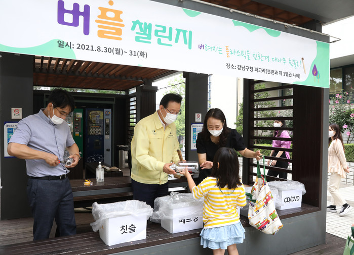 서울 강남구가 최근 이틀간 버려지는 플라스틱을 모아오면 친환경 대나무 칫솔로 교환해 주는 '버플 챌린지'를 구청 앞마당에서 진행했다. 사진은 정순균 구청장(가운데)이 챌린지에 참여한 어린이에게 친환경 대나무 칫솔을 전달하고 있는 모습. (사진제공=강남구청)
