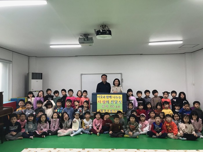 18일 서울 동대문구 휘경2동 주민센터는 휘경할매순대국과 휘경어린이집의 후원을 받아 지역내 저소득 노인 110가구에 김장김치 110상자(1060kg)를 전달했다. 사진은 김치를 전달한 휘경어린이집 관계자와 아이들이 기념촬영을 하고 있다. (사진제공=동대문구청)