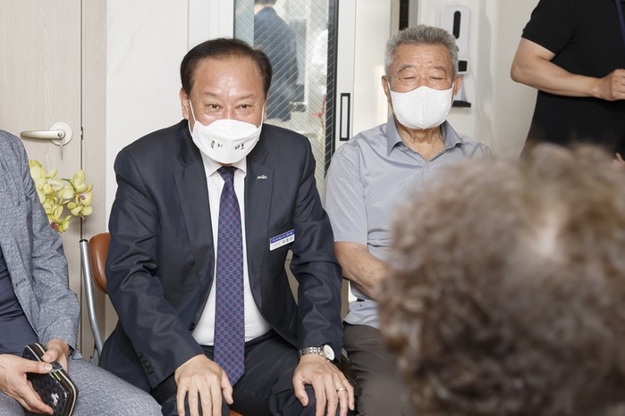 유동균 서울 마포구청장은 1일 다솜경로당(월드컵북로) 개소식에 참석했다. 구는 이용·관리에 어려움을 겪고 있던 다솜경로당의 문제 해결을 위해 새로운 건물을 매입해 2020년 이사하고 리모델링 공사를 진행해 개소하게 됐다. 사진은 개소식에서 유 구청장(가운데)이 노인들과 인사를 하고 있는 모습. (사진제공=마포구청)