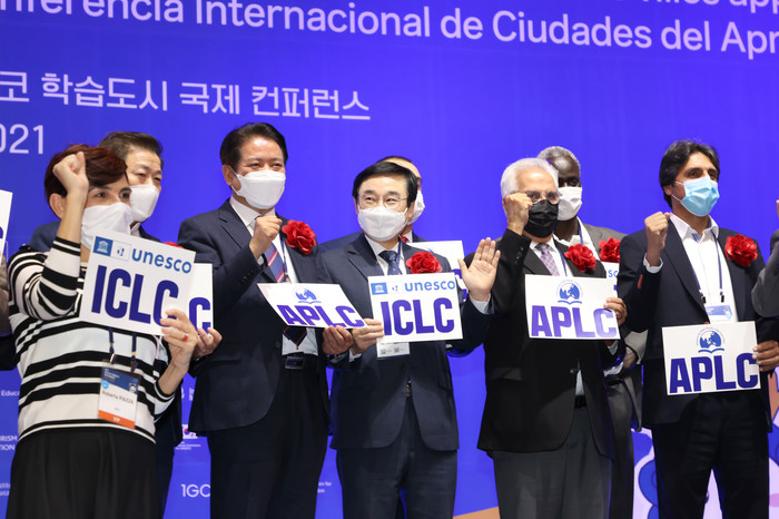 이동진 서울 도봉구청장이 최근 제5차 유네스코 학습도시 국제회의(ICLC) '2021년 유네스코 학습도시 국제 컨퍼런스'에 참석해 아시아-태평양 학습도시 권역별 회의(APRM) 주제토론에 참여했다. 사진은 컨퍼런스에서 이 구청장(가운데)이 각국의 APLC 집행위원들과 퍼포먼스를 진행하고 있는 모습. (사진제공=도봉구청)