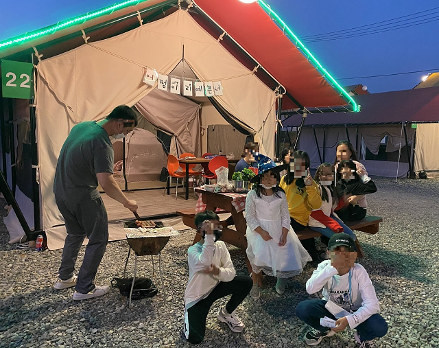| ▲ 영암군이 운영하는 '가족낭만 글램핑 캠핑프로그램'을 즐기고 있는 가족들 / 영암군 제공 |