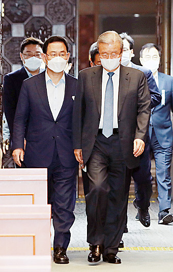 미래통합당 김종인 비상대책위원장과 주호영 원내대표가 4일 오전 서울 여의도 국회에서 열린 의원총회에서 입장하고 있다.