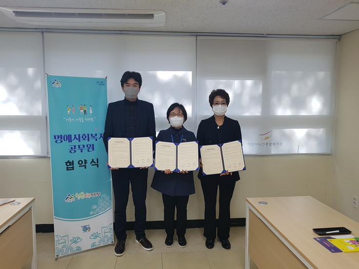 충남 아산시 행복키움지원단이 2일 복지사각지대 발굴을 위한 명예사회복지공무원 위촉 업무협약 및 특강을 진행했다. 협약을 통해 복지관 직원·생활지원사 등은 명예사회복지공무원으로 위촉돼 도움이 필요한 시민을 상시 발굴하고 도움을 연계하는 역할을 수행하게 된다. 사진은 협약식에서 관계자들이 기념촬영을 하는 모습. (사진제공=아산시청)