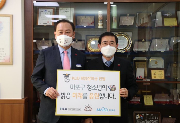 서울 마포구는 최근 한국지역정보개발원으로부터 마포구 중고생 10명에게 지원할 920만원의 장학금을 전달받았다. 사진은 전달식에서 유동균 구청장(왼쪽)이 지대범 한국지역정보개발원장과 기념촬영을 하는 모습. (사진제공=마포구청)