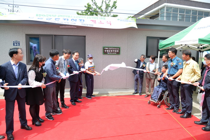 경기 포천시가 지역내 노인들의 일자리 창출과 경제적 자립을 돕기 위해 시 노인복지관에 위탁한 노인일자리 공동작업장 3호점 '반월공동작업장'을 4일 문 열었다. 사진은 이날 개소식에 참석한 박윤국 시장과 내외빈들이 테이프 커팅을 하는 모습. (사진제공=포천시청)