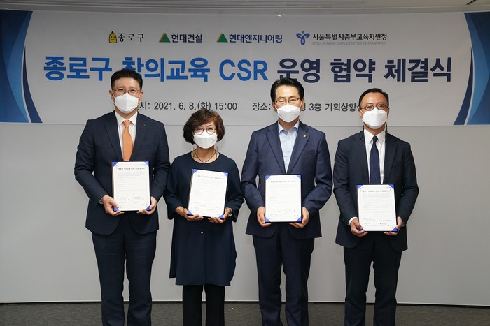 서울 종로구가 최근 기업연계 창의교육 운영을 위해 현대건설·현대엔지니어링, 중부교육지원청과 업무협약을 맻고 구 창의교육의 성공적인 운영을 위한 인적·물적 자원의 상호 연계 및 지원 등을 약속했다. 사진은 협약식에서 김영종 구청장(오른쪽 두 번째)과 관계자들이 기념촬영을 하는 모습. (사진제공=종로구청)