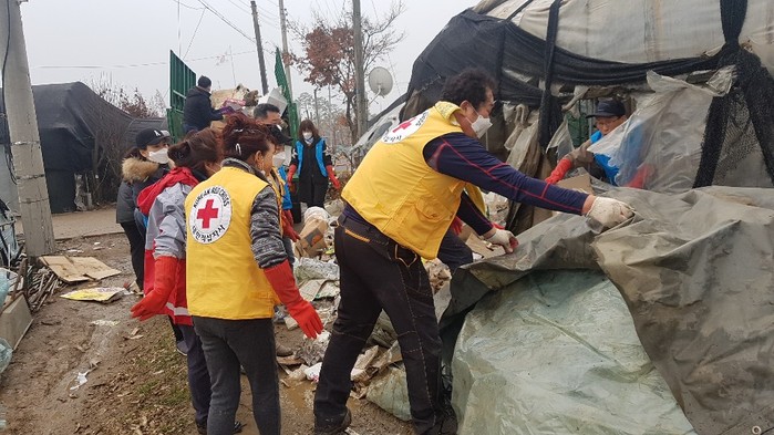 경기 구리시 교문2동이11일 비닐하우스 컨테이너에서 생활하는 지역내 취약계층 가구를 대청소했다. 이날 청소에는 동 적십자봉사회, 명예 사회복지공무원, 백문초등학교 학무모회 등 20여명이 참여했다. 사진은 쓰레기를 치우는 모습. (사진제공=구리시청)