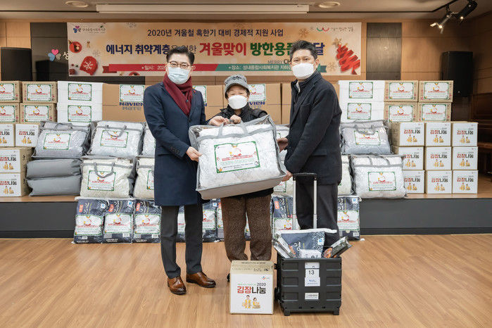 서울 강동구가 최근 성내종합사회복지관에서 에너지 취약계층을 위한 ‘겨울맞이 방한용품 전달식’을 열고, 갈비탕·온수매트 등 방한용품 꾸러미를 홀몸노인 30가구에 전달했다. 사진은 방한용품 전달식에서 이정훈 구청장(왼쪽)이 관계자들과 기념촬영을 하는 모습. (사진제공=강동구청)