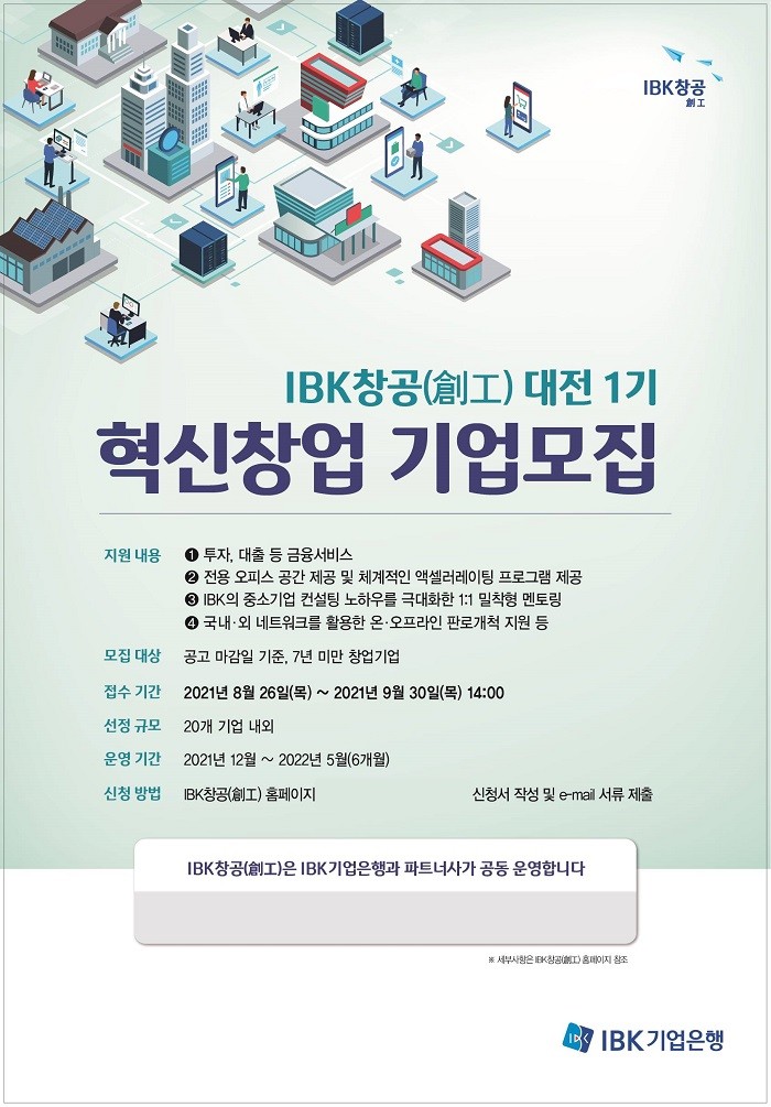 [시민일보 = 이승준] IBK기업은행(은행장 윤종원)이 창업육성 플랫폼 ‘IBK창공(創工)’ 대전 센터의 혁신 창업기업 1기 모집을 실시한다고 전했다.