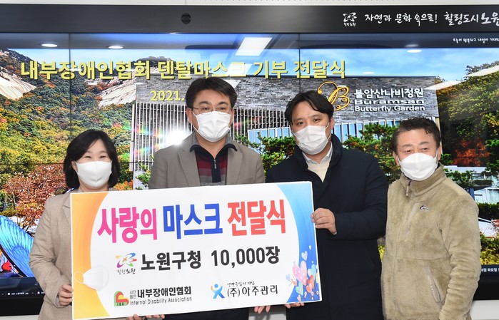 서울 노원구는 16일 내부장애인협회로부터 코로나19 방역을 위한 덴탈마스크 1만장을 기부받았다. 사진은 기부식에서 오승록 구청장(왼쪽에서 두 번째)이 관계자들과 기념촬영을 하는 모습. (사진제공=노원구청)