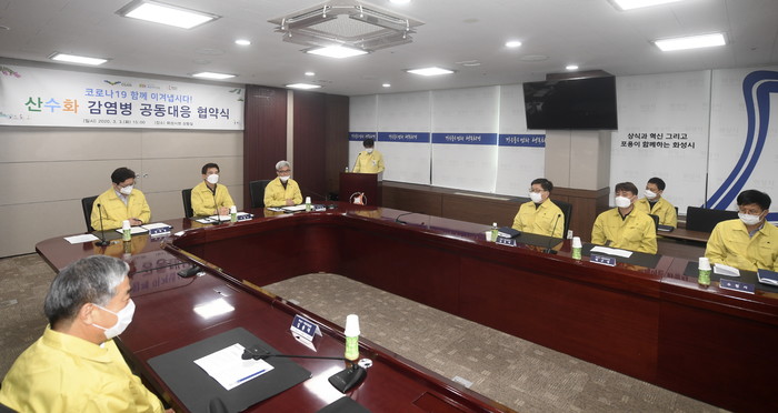 경기 오산시와 수원시, 화성시는 3일 코로나19 공동대응 강화를 위한 협약을 체결하고 감염병 관리 정책·주요사례 공유 등을 통해 함께 위기를 극복해 나가기로 했다. 사진은 협약식에 참석한 시장 및 관계자들 모습. (사진제공=오산시청)