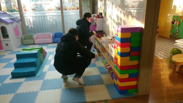 경기 수원시 권선구는 지난 8~9일 양일간 지역내 가정어린이집 199곳에 예방차원의 실내방역을 실시했다. 권선구 생활안전과와 각 동 행정복지센터에서는 신종 코로나바이러스에 취약한 지역내 어린이들의 안전을 위해 주말 동안 가정어린이집을 방문해 손의 접촉이 자주 일어나는 곳(화장실·문 손잡이·장난감) 등을 중점 소독했다. 사진은 참여자들이 소독을 진행하는 모습. (사진제공=권선구청)