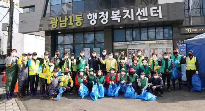 경기 광주시 광남1동·2동은 최근 직리천 일원(광남생활체육공원 하부~무명교 구간)에 쌓인 하천 쓰레기 및 부유물을 대대적으로 수거하는 ‘새봄맞이 하천변 환경정화 활동’을 실시했다. 사진은 이날 참여한 봉사자들과 신동헌 시장(뒷줄 가운데)이 기념촬영을 하는 모습. (사진제공=광주시청)