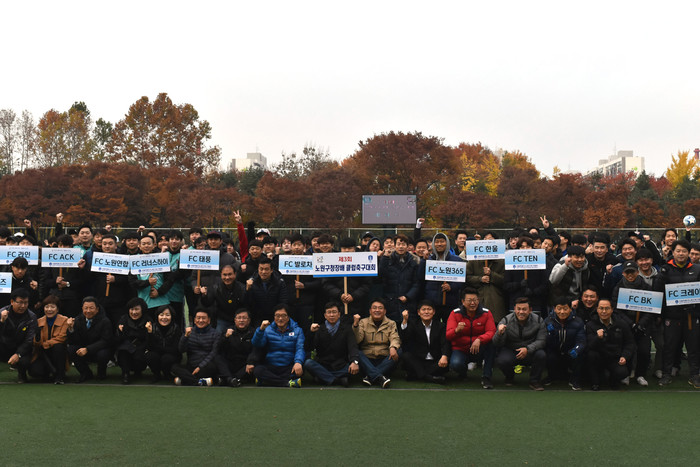 노원구는 17일 마들스타디움에서 ‘제3회 노원구청장배 클럽축구대회’를 개최했다. 이날 대회에 참석한 오승록 구청장은 축구인들이 마음껏 운동할 수 있는 도시를 조성하겠다고 말했다. 사진은 오 구청장이 참가자들과 기념촬영을 하는 모습. (사진제공=노원구청)