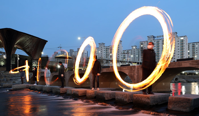 정월대보름을 며칠 앞둔 23일 오후 광주천 두물머리에서 주민들과 구청 직원들이 코로나19 극복을 기원하며 쥐불놀이하고 있다.