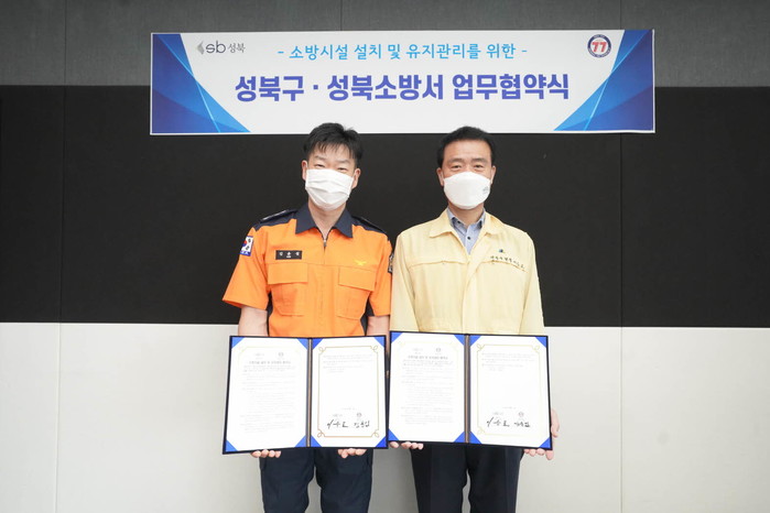 서울 성북구가 최근 서울 성북소방서와 ‘소방시설 설치 및 유지관리’에 관한 업무협약을 체결했다. 이번 협약으로 화재사고 발생시 소방시설을 즉각 활용할 수 있도록 지역내 770곳에 달하는 '보이는 소화기' 등 옥외 소방시설을 지속 유지·관리하기로 했다. 사진은 협약 체결 후 이승로 구청장(오른쪽)이 김윤섭 성북소방서장과 기념촬영을 하는 모습. (사진제공=성북구청)