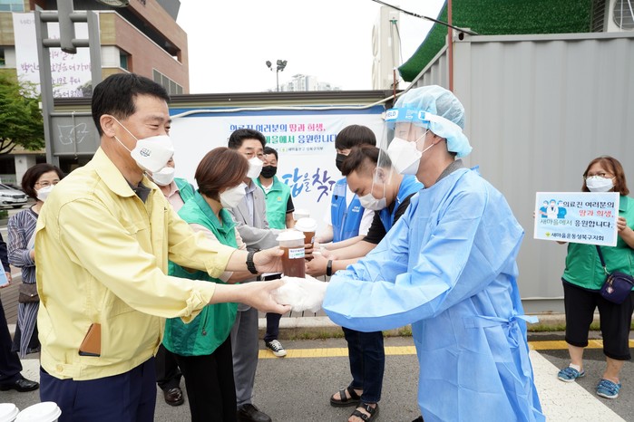 서울 성북구 제1예방접종센터 및 선별진료소 등 5개 시설은 26일 성북구 새마을문고 회원들로부터 감사와 응원이 가득 담긴 음료와 떡 300인분을 전달받았다. 사진은 이승로 구청장(맨 앞 왼쪽)과 성북구 새마을문고 회원들이 성북구청 바람마당 선별진료소와 제1예방접종센터 의료진, 공무원에게 응원의 간식을 전하는 모습. (사진제공=성북구청)