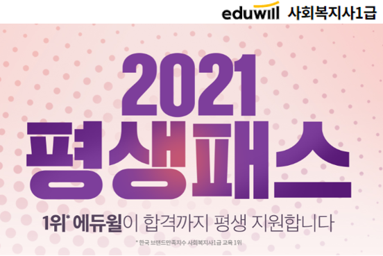 [시민일보 = 여영준 기자] 종합교육기업 에듀윌(대표 박명규)이 사회복지사1급 시험을 준비하는 수험생을 위해 ‘2021 평생패스’ 과정을 선보인다.
