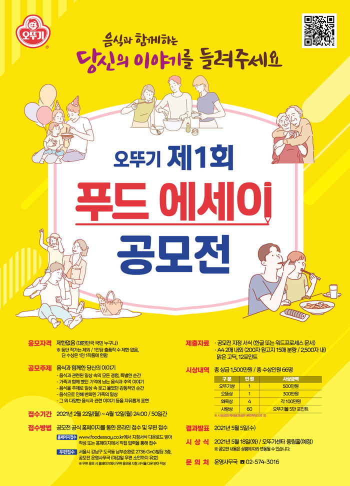 ‘오뚜기 제1회 푸드 에세이 공모전’ 은 총 상금 1500만원 규모로, 오뚜기상(1명) 상금 500만원, 으뜸상(1명) 상금 300만원, 화목상(4명) 각 100만원의 상금이 주어진다. 이외에도 사랑상 60명에게는 오뚜기 온라인 공식 쇼핑몰인 ‘오뚜기몰’에서 사용 가능한 구매 포인트 5만점이 주어진다.