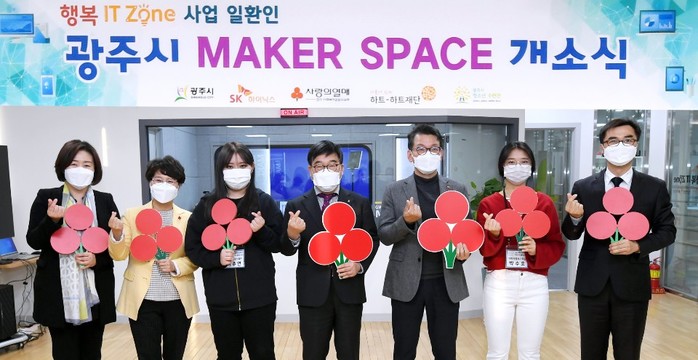 경기 광주시는 26일 SK하이닉스와 함께 광주시 청소년수련관에서 지역 최초로 자신이 필요한 아이디어와 설계를 통해 스스로 제작할 수 있도록 필요한 도구를 갖춘 공동 작업실인 ‘광주시 메이커스페이스’ 개소식을 개최했다. 사진은 개소식에서 신동헌 시장(가운데)이 관계자들과 기념촬영을 하는 모습. (사진제공=광주시청)