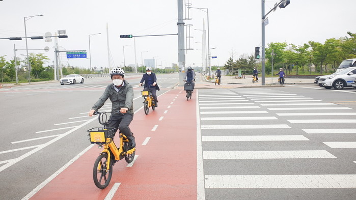 인천 서구가 26일 아라뱃길~청라호수공원 간 자전거도로 정비공사 구간을 자전거를 타고 직접 이동하는 방식으로 자전거도로 활성화 사업의 진행 상황을 확인했다. 사진은 이재현 구청장(앞쪽)이 자전거를 타고 아라뱃길~청라호수공원 자전거도로를 점검하고 있는 모습. (사진제공=서구청)
