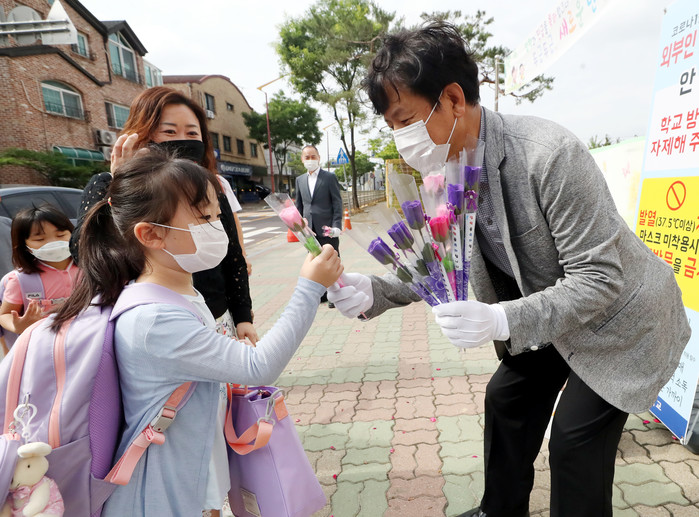 경기 부천지역 특수학교, 유치원, 초·중·고등학교(고3 제외) 등교 수업이 시작된 11일 오전 부천시 송내동 솔안초등학교에서 한 교사가 처음 입학하는 학생에게 꽃을 선물하며 축하하고 있다.