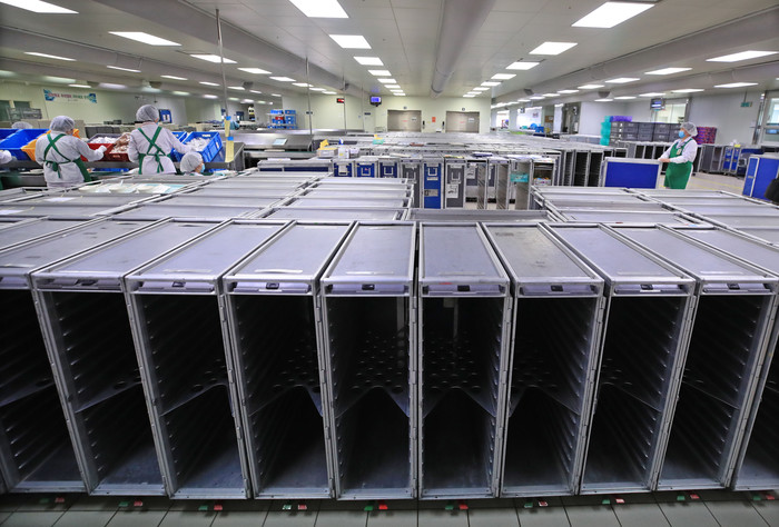 항공업계가 코로나19의 세계적 대유행(팬데믹·pandemic)으로 직격탄을 맞은 가운데 2일 대한항공 인천 기내식 센터에 밀 카트가 텅 비어있다.