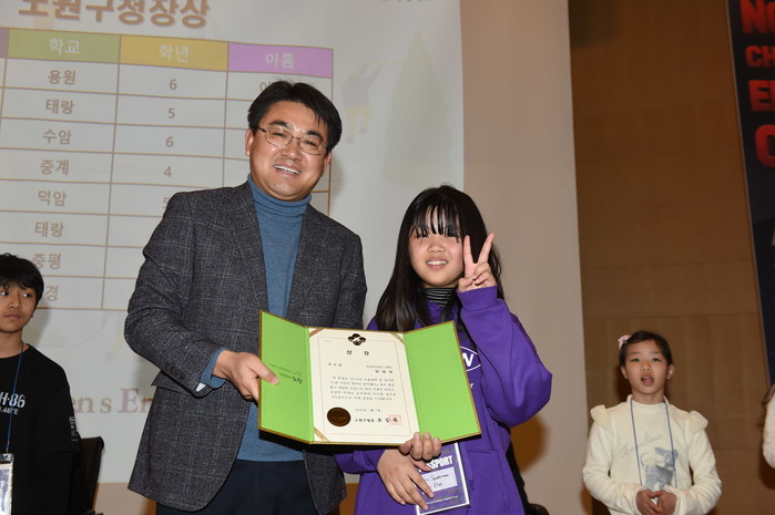 서울 노원구는 7일 삼육대학교 요한관 강당에서 ‘노원 어린이 영어캠프 1차 수료식’을 개최했다. 영어캠프는 영어에 대한 흥미를 고취시키기 위해 운영되고 있다. 사진은 오승록 구청장(오른쪽)과 우수학생이 기념촬영을 하는 모습. (사진제공=노원구청)