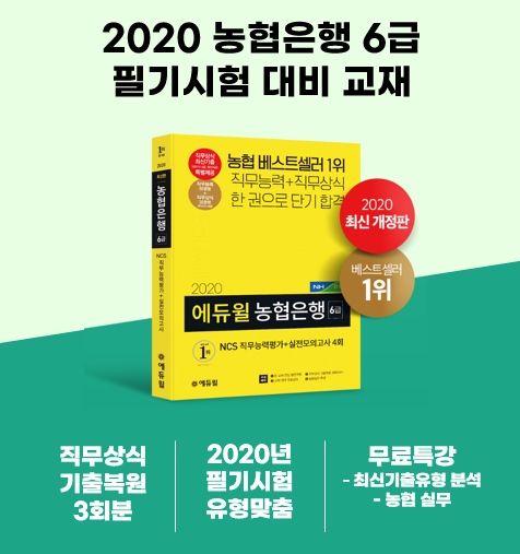 28일 에듀윌에 따르면 ‘2020 에듀윌 농협은행 6급 NCS 직무능력평가+실전모의고사 4회’는 2019년 처음 도입된 6급 직무상식 문제와 2018, 2019년 5급 직무상식 문제까지 복원해 최신 출제 경향을 파악하고 공부 방향성을 잡을 수 있도록 한 것이 특징이다.