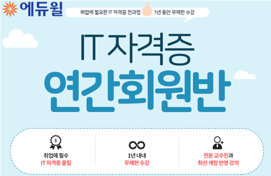 [시민일보 = 황혜빈 기자] 종합교육기업 에듀윌(대표 박명규)은 취업에 필요한 IT자격증 5종 취득을 지원하는 'IT자격증 연간회원반' 과정을 선보인다고 23일 밝혔다.